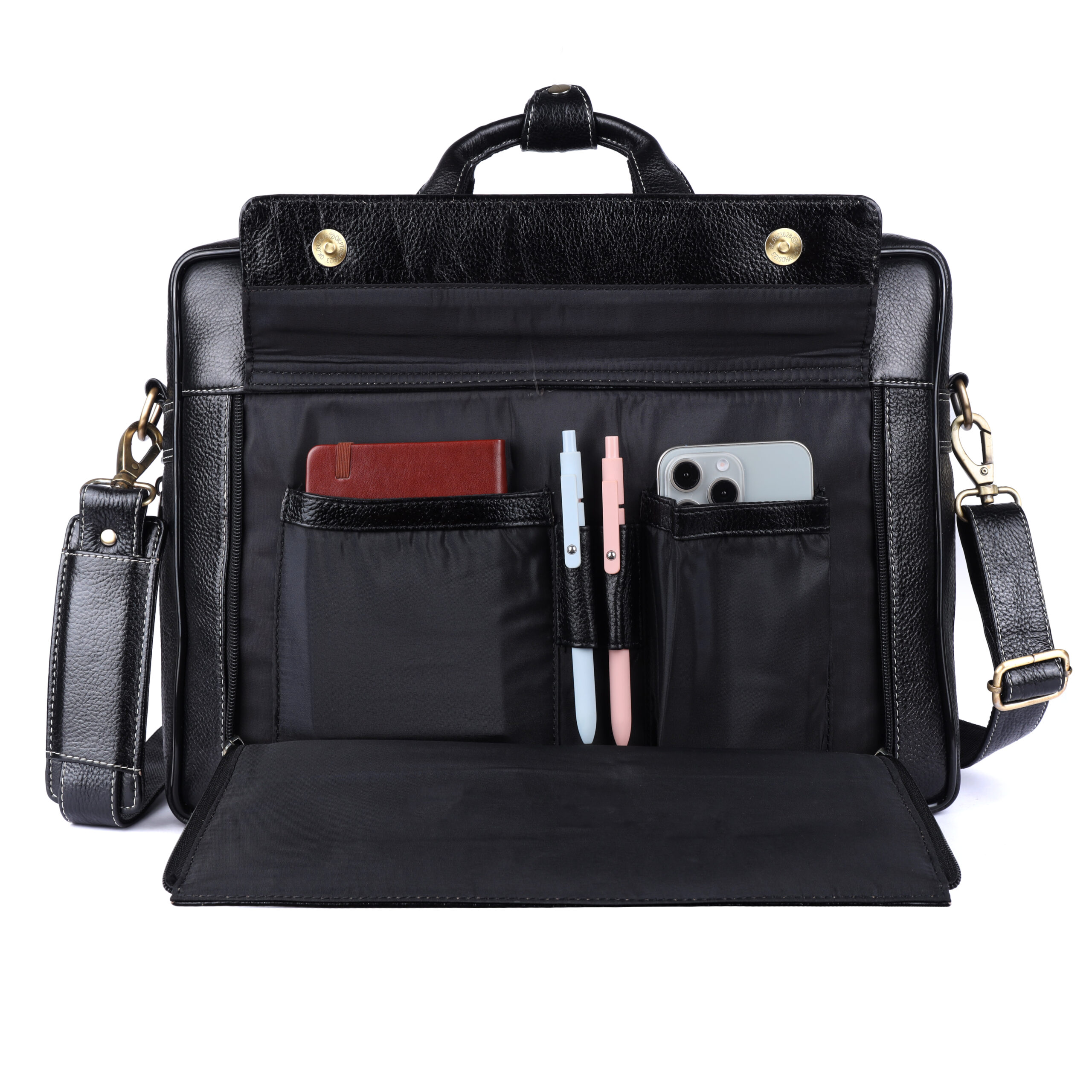 Thoughtfully designed, the bag features a spacious main compartment that comfortably fits up to a 15.6-inch laptop, along with separate sections for documents, notebooks, and accessories. A front zippered pocket provides easy access to essentials like your phone, wallet, or keys, ensuring everything stays organized and within reach.